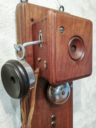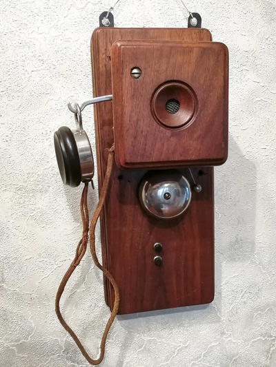 Изготовлен фирмой Bell Telephone Manufacturing Company в Антверпене, Бельгия. Этот настенный телефон Bell имеет не циферблат, а две кнопки, с помощью которых отправляется сигнал оператору. В телефоне сохранился оригинальный тканевый шнур на трубке. Корпус в комплекте со всеми деталями сделан из древесины европейского ореха.
