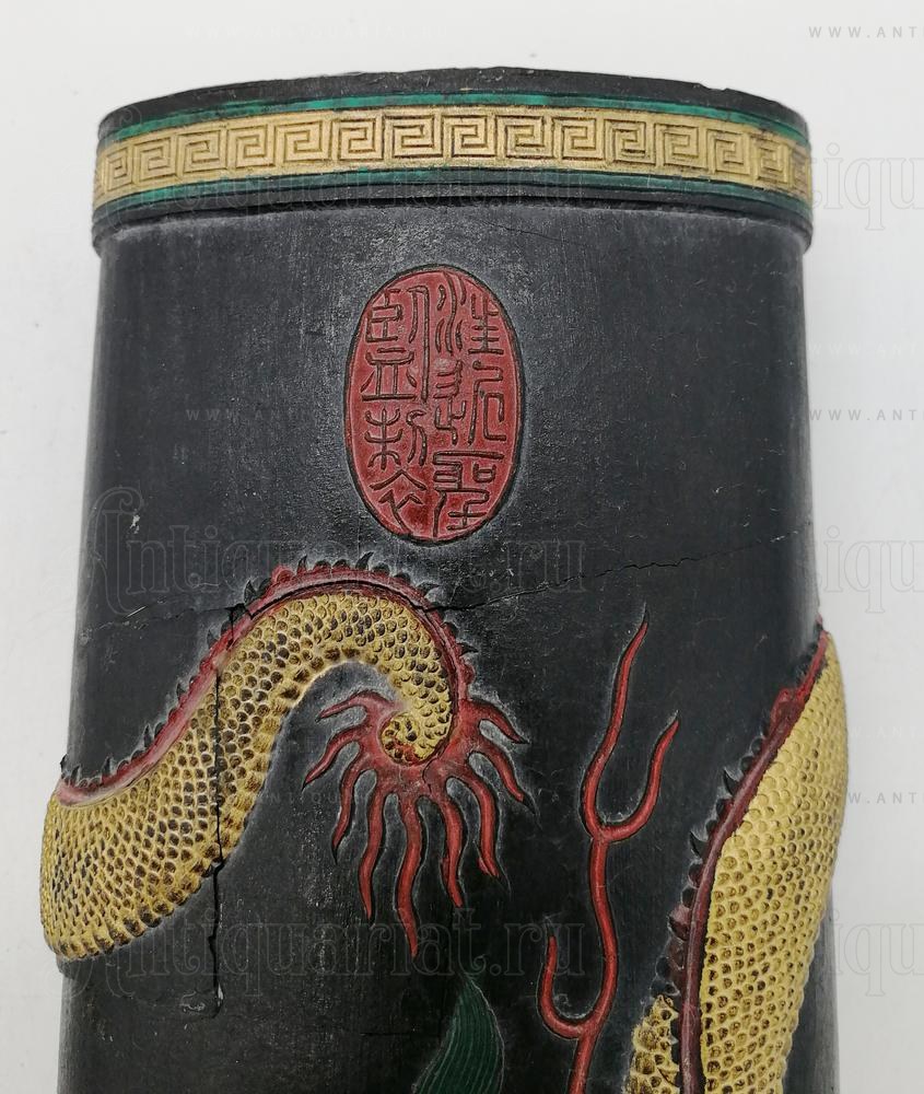 На лицевой части предмета отпечатаны китайские иероглифы: 舞鳳翔龍, что в переводе на русский язык это означает - «Танцующий феникс, парящий дракон» (или «Танец феникса и полёт дракона»).