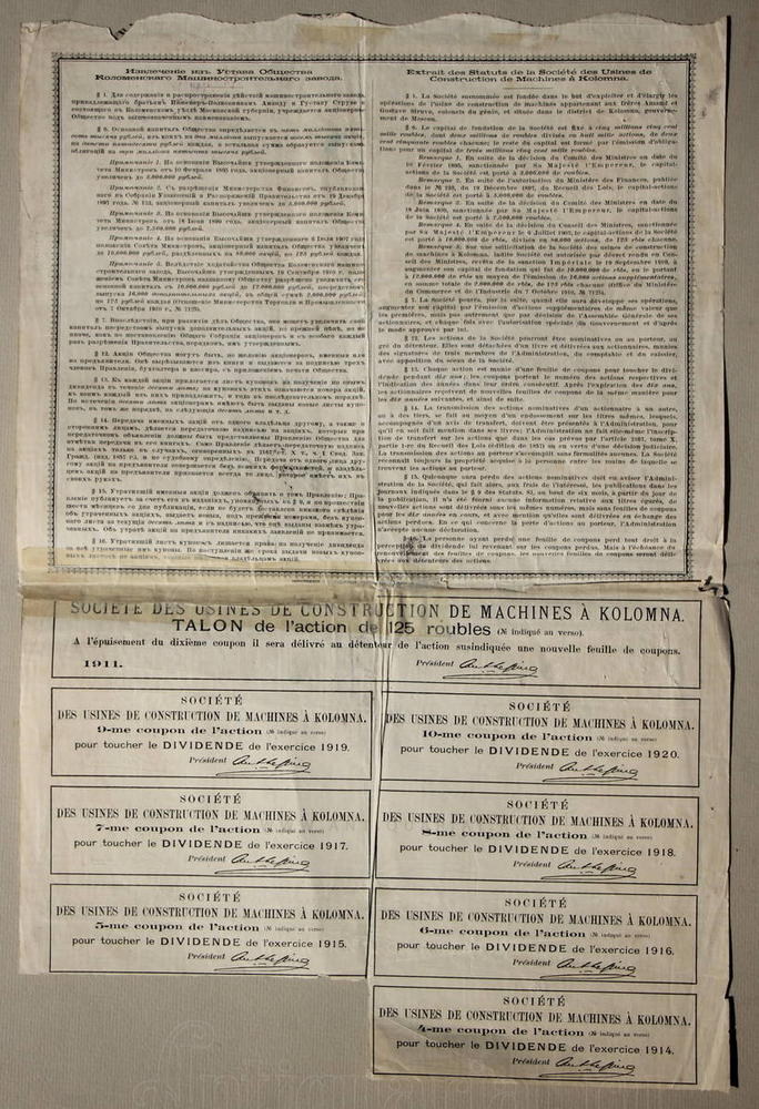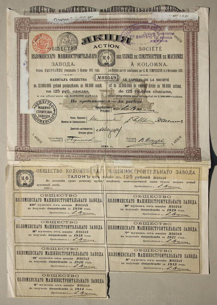 Акция в 125 рублей на предъявителя. №80349. На русском и французском языках