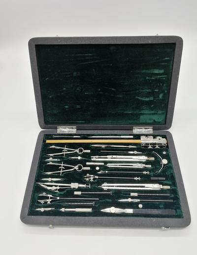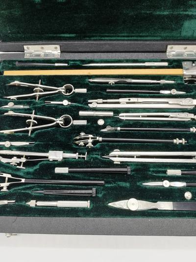 В наборе имеются: циркуль большой, циркуль малый, измеритель большой, измеритель малый, крон циркуль, крон измеритель, циркуль балеринка, три рейсфедера (разной величины) для прямых линий, два рейсфедера для параллельных линий, чертежный штангенциркуль для окружностей радиусом до 550 мм., а таже комплект оснастки и съемных насадок. (см. фото).