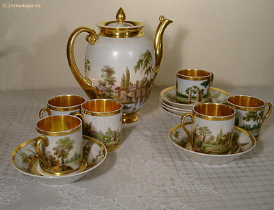 Украшен полихромной пейзажной живописью (на каждом предмете – отличающийся от других ландшафт), с широкими золотыми обводками по краям, чашки изнутри покрыты золотом, их ручки, а также ручка и носик чайника тоже золотого цвета.