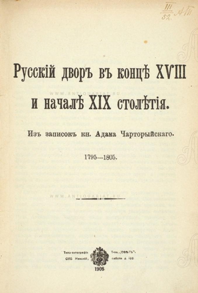 [Конволют] Русский двор в конце XVIII и начале XIX столетия. Из записок кн. Адама Чарторыйского. 1795-1805. СПб.: Типо-лит. Т-ва «Свет», 1908. Х, 162 с.