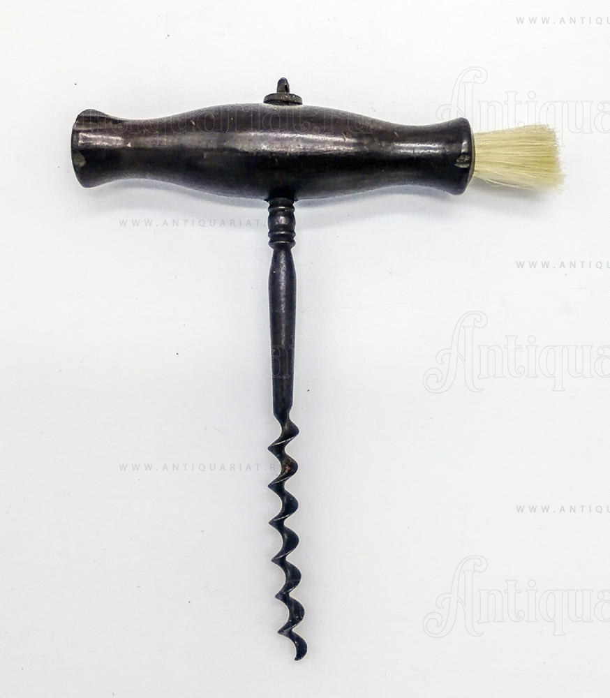 Хватка выполнена из древесины. Крепление к хватке осуществлено посредством гайки сверху. Хватка оснащена кисточкой из щетины для удаления с горлышка бутылки крошек и пыли. Рабочая часть штопора оснащена гладкой червячной спиралью. Исправен и в рабочем состоянии. Имеются незначительные сколы на деревянной хватке.