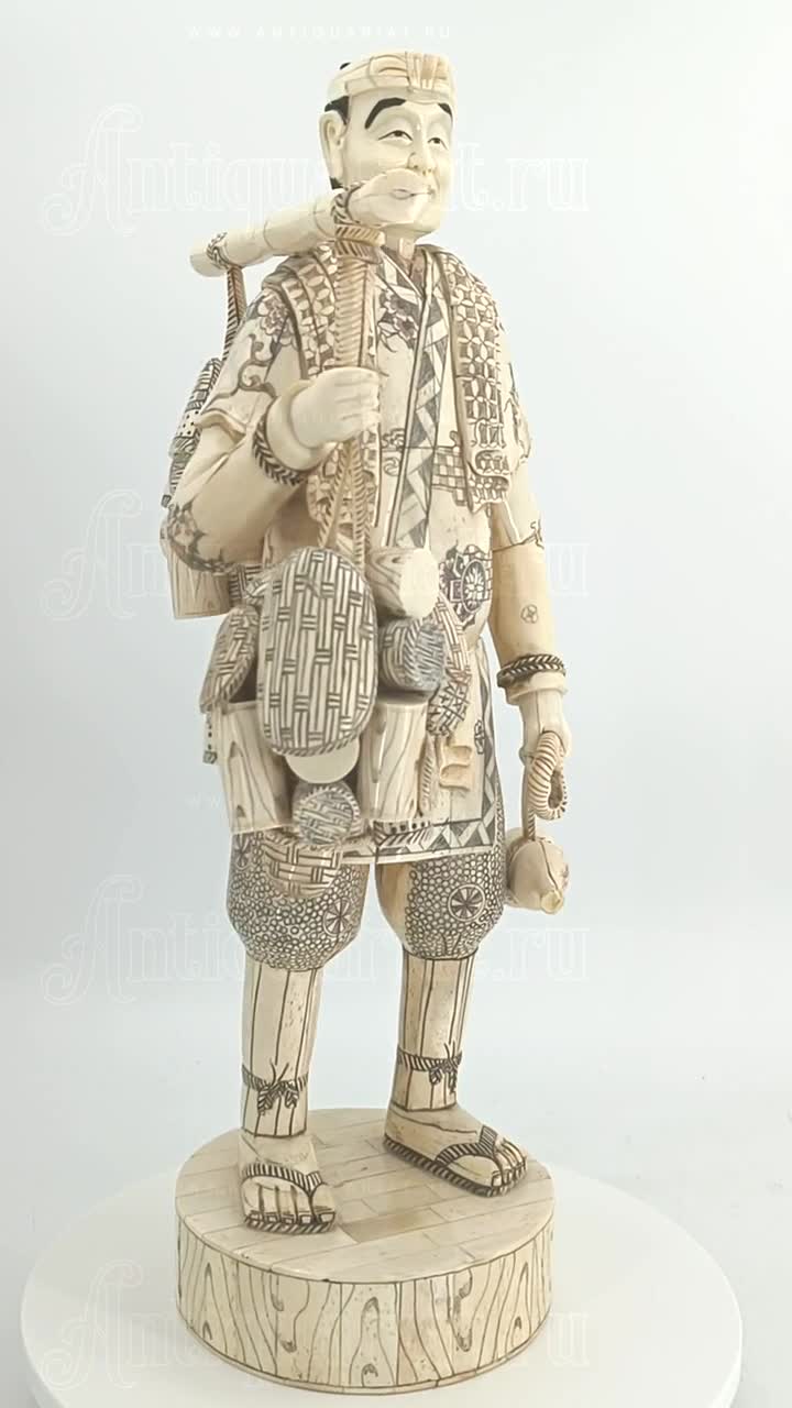 Данная скульптура это прекрасный образец японской антикварной скульптуры, выполненный в стиле окимоно (настольных статуэток) в конце 19 века, в период эпохи Мейдзи (Meiji Era), когда Япония переживала значительные изменения и модернизацию. Это произведение искусства изготовлено из кости, и его высота составляет 50 см, что позволяет тщательно проработать мельчайшие детали и придать изделию уникальный характер.