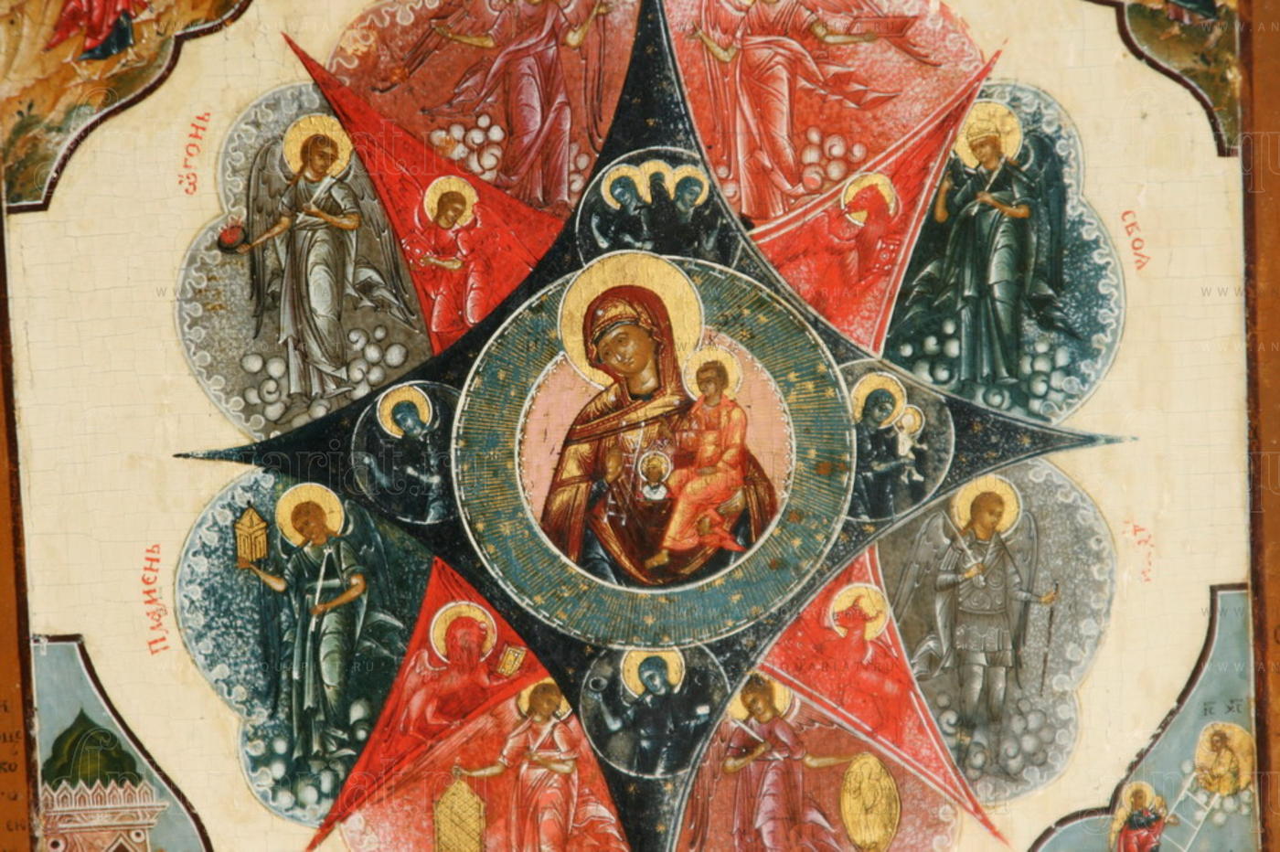 Другая тема иконы - служение ангелов Богоматери и поклонение небесных сил чудесному рождению Бога от Девы - их изображения располагаются в лучах восьмиконечной звезды.