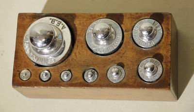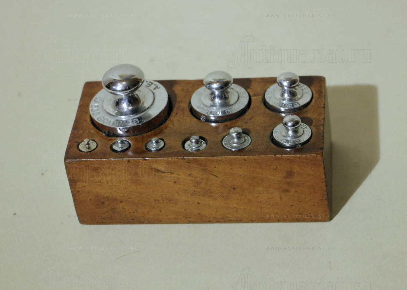 В наборе 9 бронзовых хромированных гирь весом от 1 до 500 г. Гири размещены в оригинальной подставке из дерева.