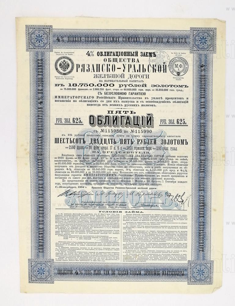 Пять облигацiй с №115986 по №115990 на шестьсот двадцать пять рублей золотомъ на предъявителя. С.-Петербург 1894 г