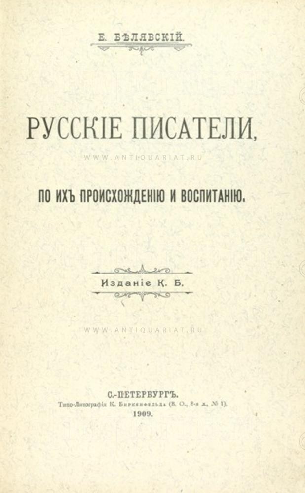 Белявский, Е. Русские писатели, по их происхождению и воспитанию. СПб.: Типо-лит. К. Биркенфельда, 1909. [2], 112, [2] с.