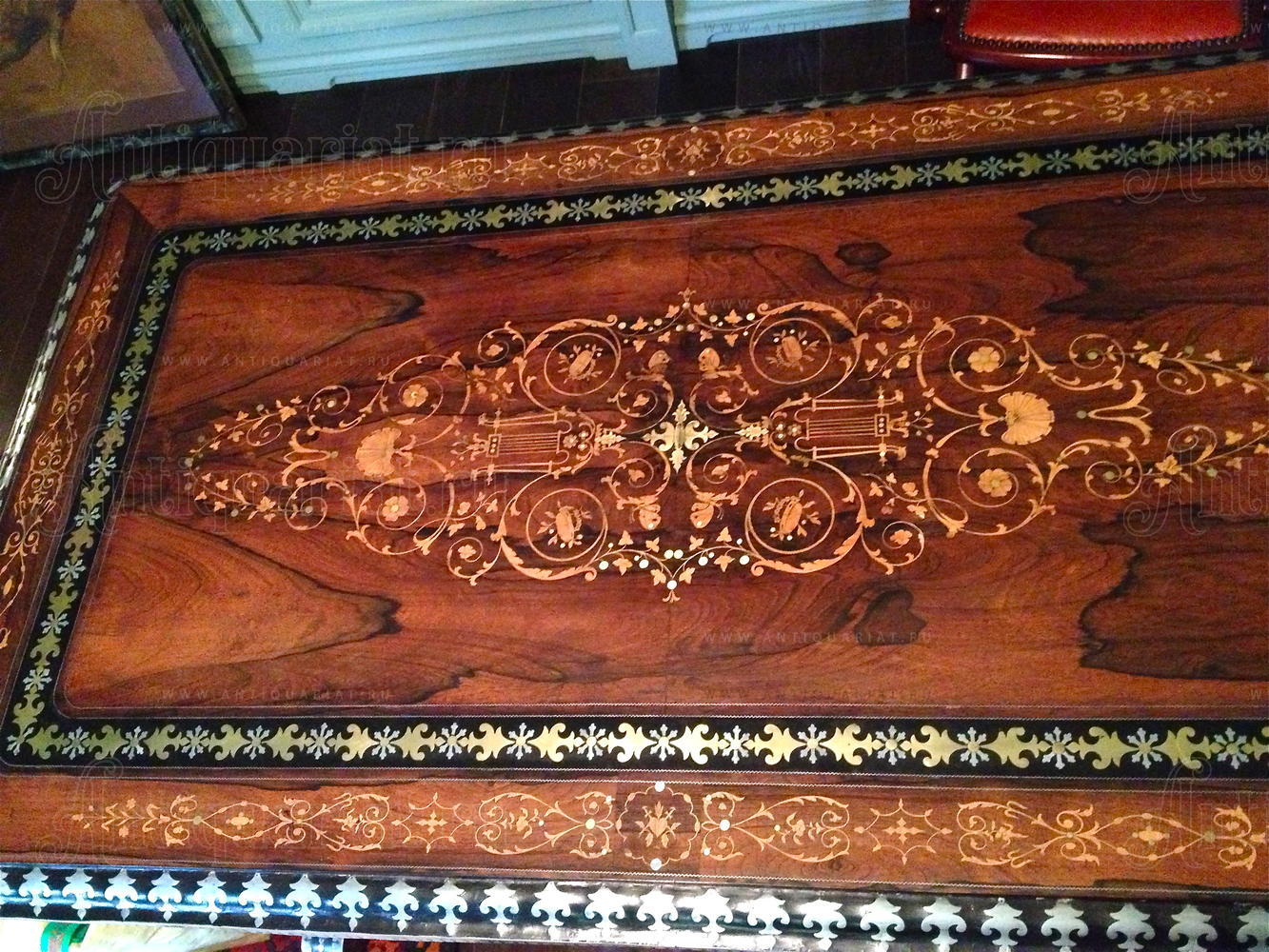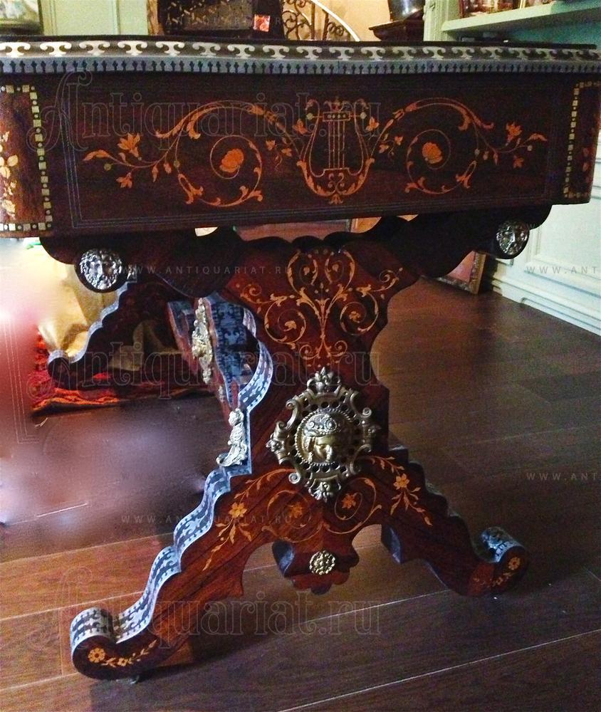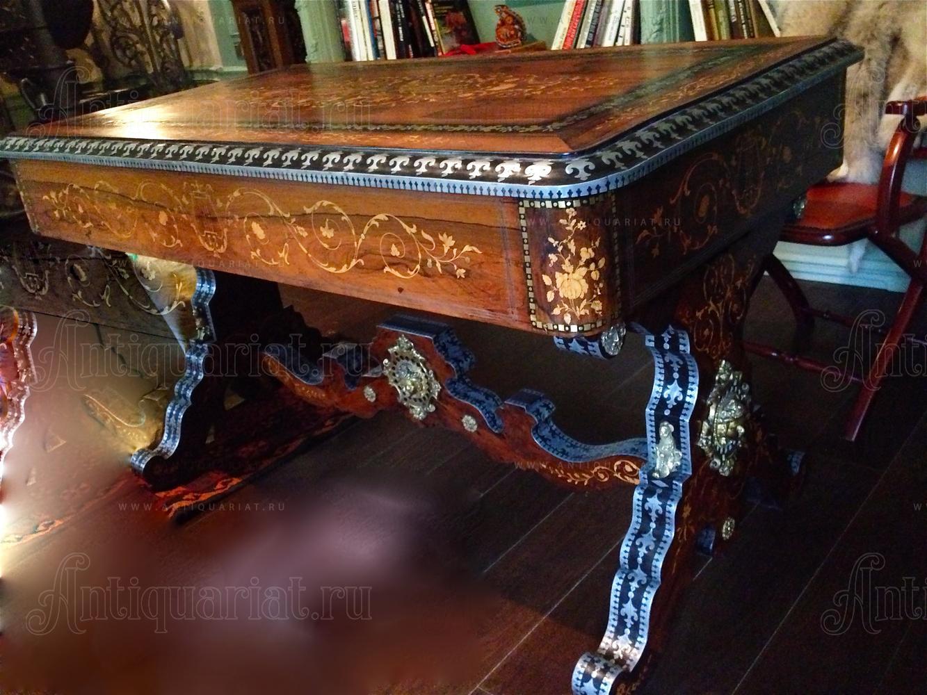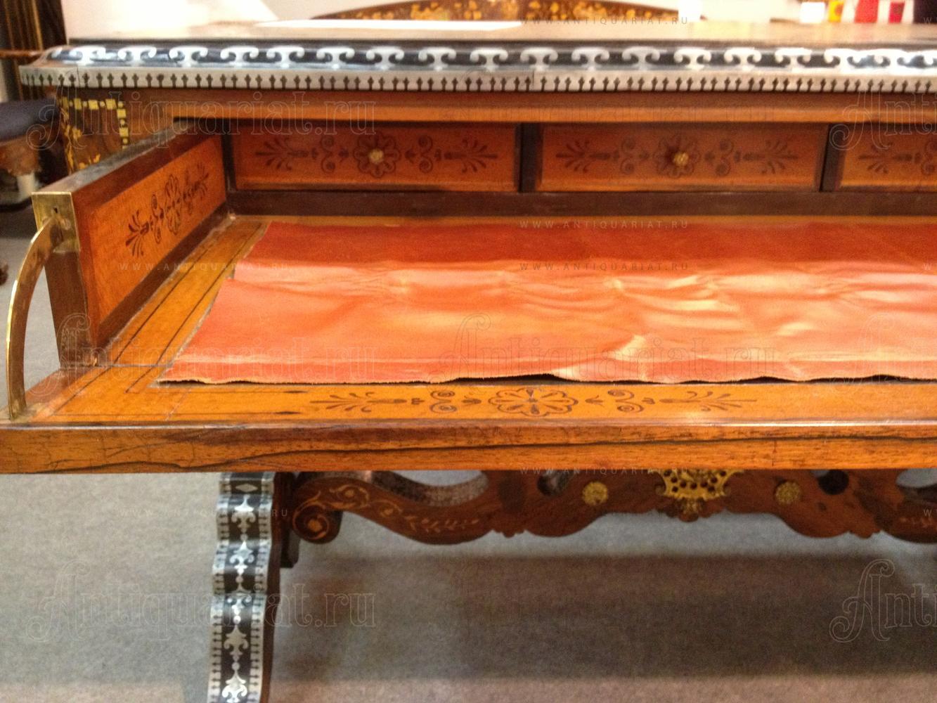 Стол-бюро кабинетный прямоугольный, на фигурных боковых опорах с проногой, в стиле неоренессанс. Декорирован инкрустацией и интарсией.