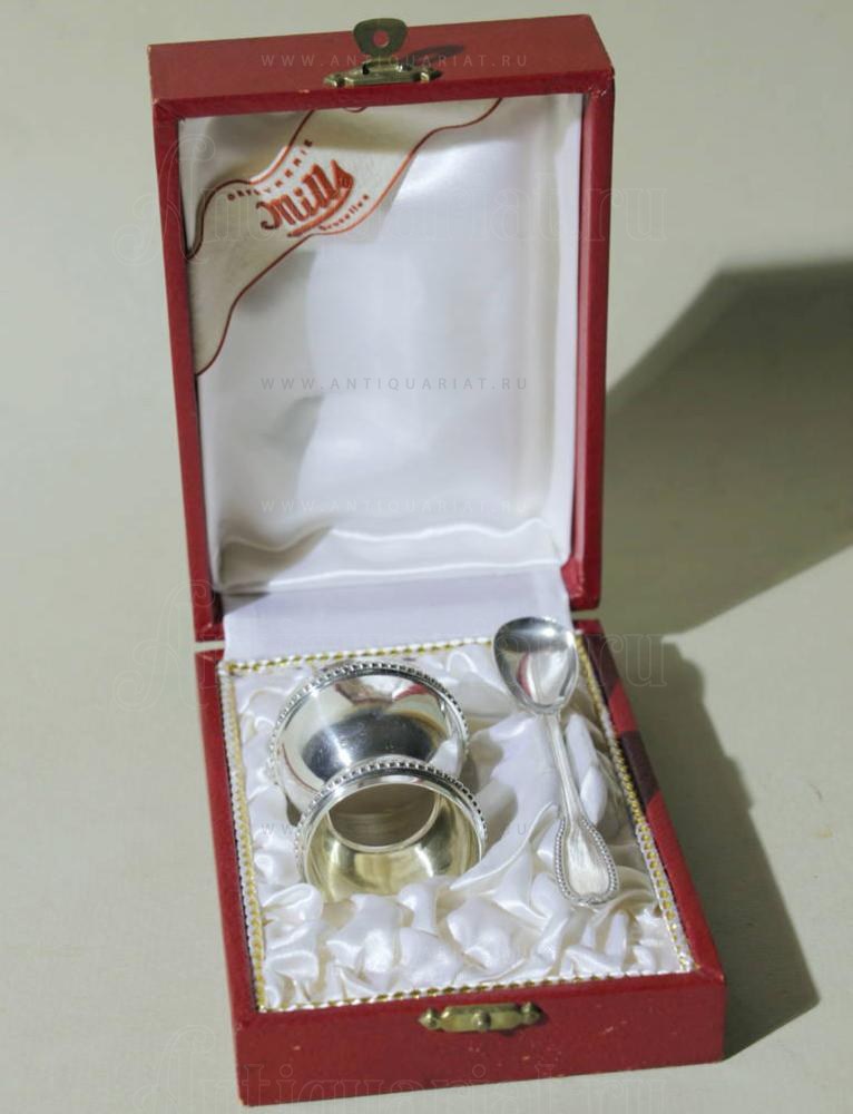 Серебряная пашотница в футляре бельгийского торгового дома, в набор входят подставка для яйца и ложечка.