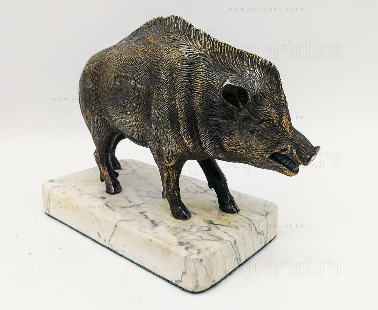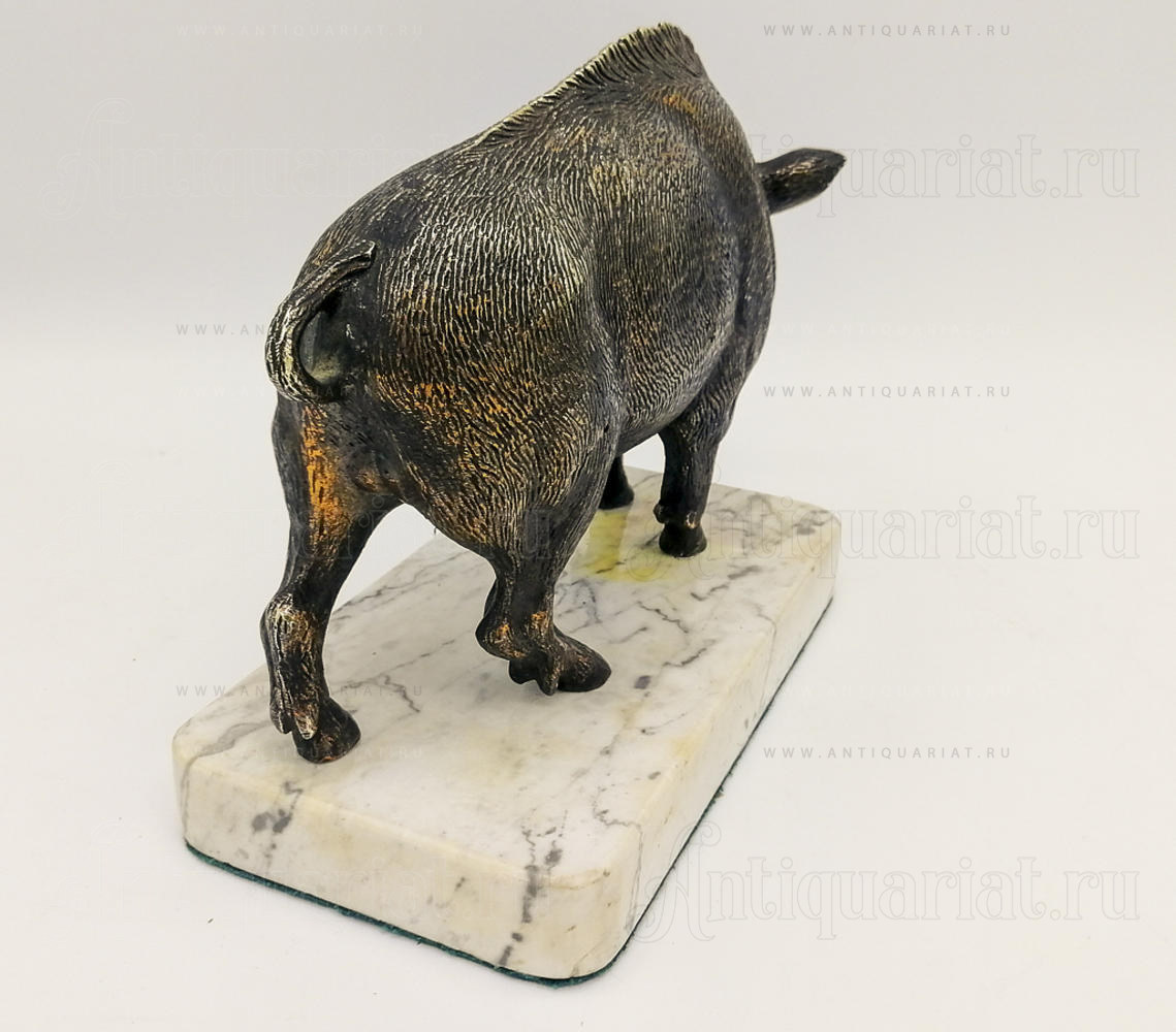 Скульптура изготовлена из литой бронзы с последующей детальной прочеканкой. Высокое качество проработки деталей. Фигура установлена на мраморном основании.