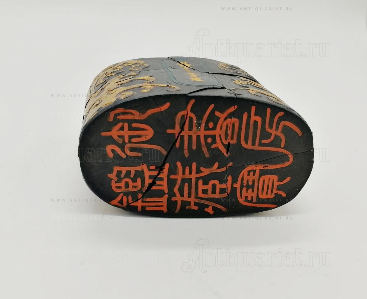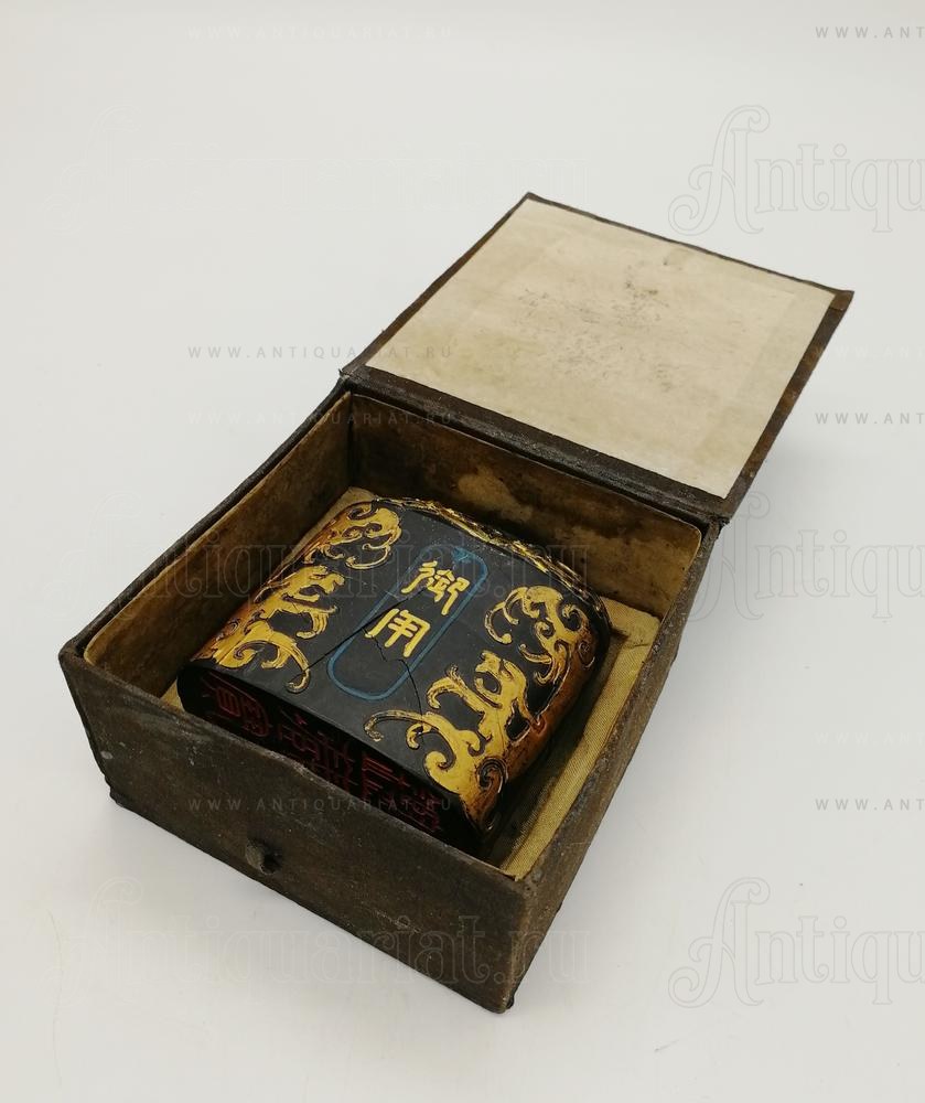 Брусок туши изготовлен на острове Хайнань. Его декоративное оформление представляет стилизованную портовую печать украшенную золотыми надписями и драконами.
