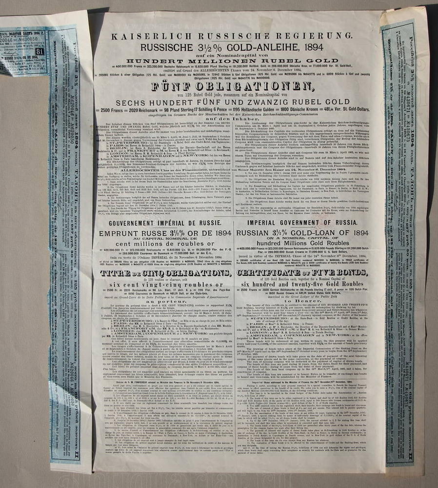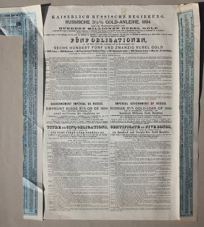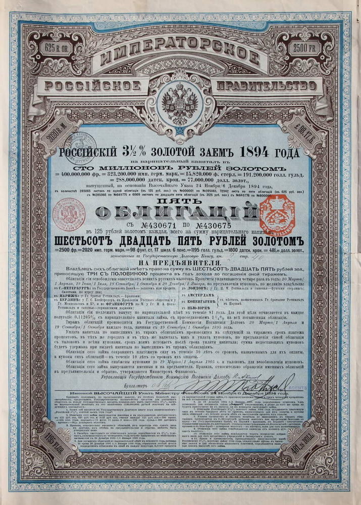 Российский 3 1/2 % золотой заем 1894 года. Императорское Российское правительство.