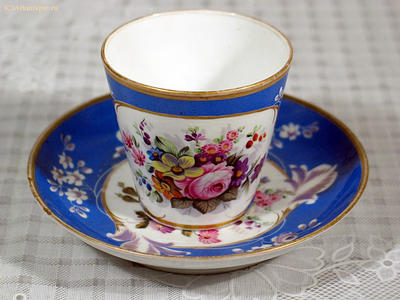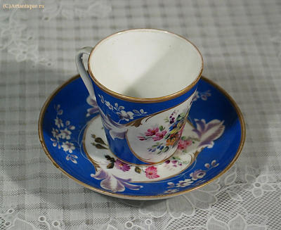 Отличной сохранности подарочная чайная пара, состоит из чашки и блюдца. Основной васильково-синий фон с изысканной полихромной цветочной росписью в белых резервах, особую нарядность придаёт золотая подрисовка.