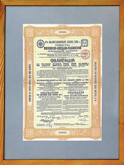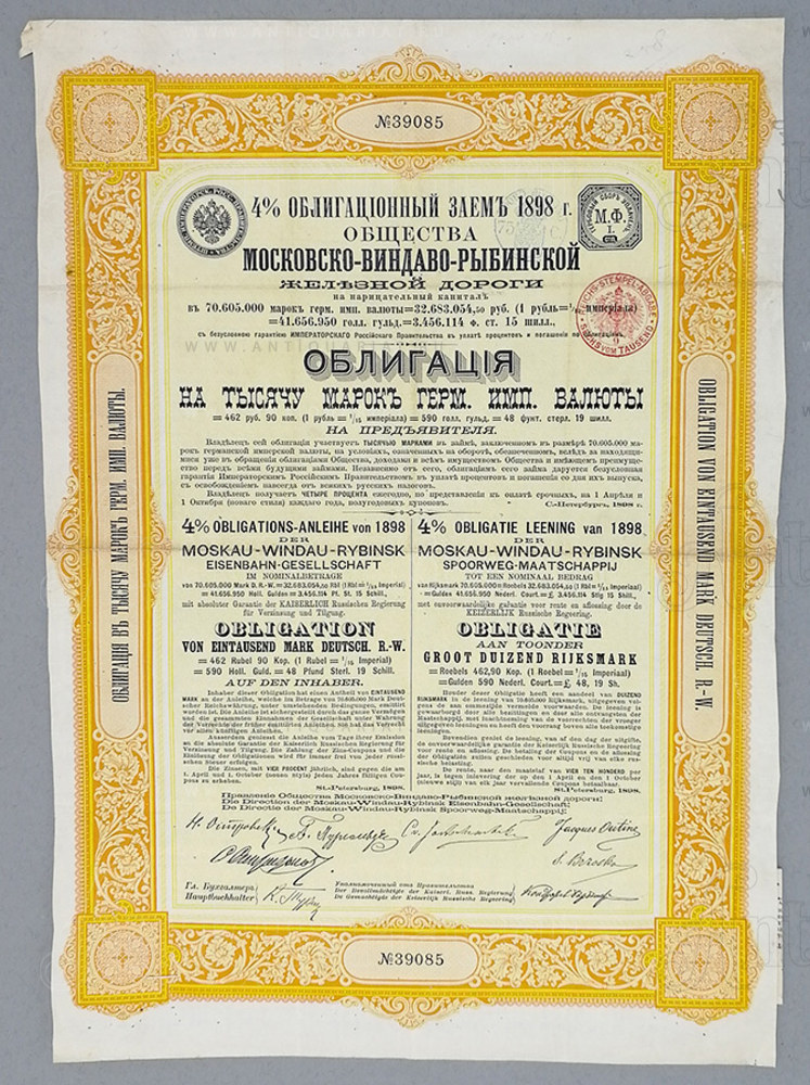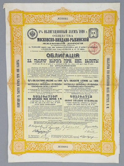 "МОСКОВСКО-ВИНДАВО-РЫБИНСКОЙ железной дороги". Облигацiя на тысячу марокъ герм. имп. валюты. №39085