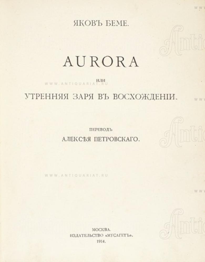 [За что Бёме подвергся гонениям?] Бёме, Я. Aurora, или Утренняя заря в восхождении / пер. Алексея Петровского. М.: Мусагет, 1914. XV, 406, [10] c., 1 л. портр.