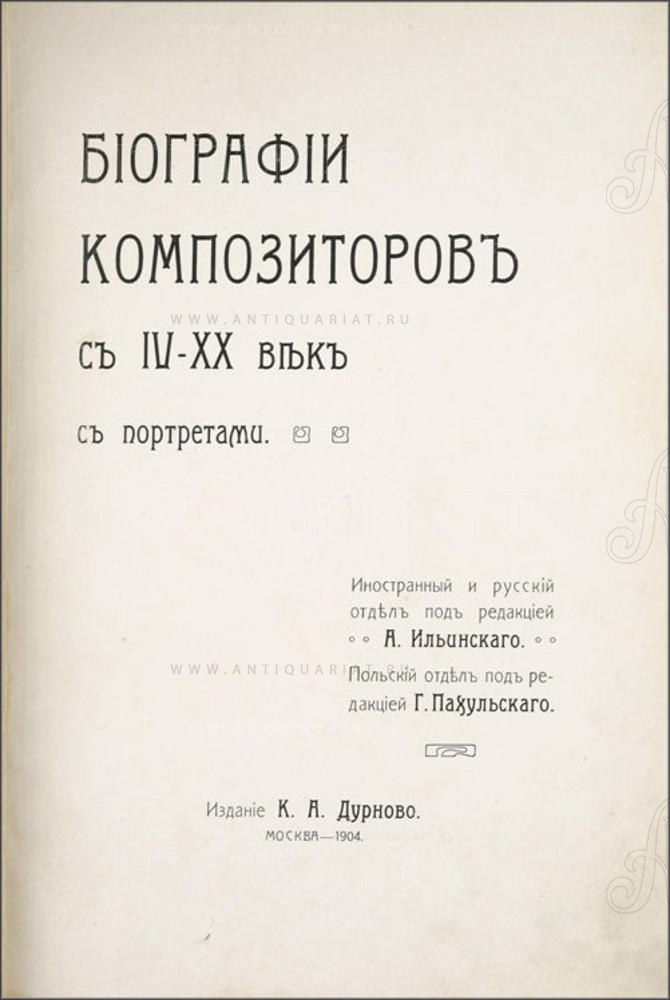 [Роскошный подносной экземпляр] Биографии композиторов с IV—ХХ век. С портретами. Иностранный и русский отдел под редакцией А. Ильинского. Польский отдел под редакцией Г. Пахульского. Издание К.А. Дурново. М.: Типо-литография Т-ва И.Н. Кушнерев и Ко, 1904.