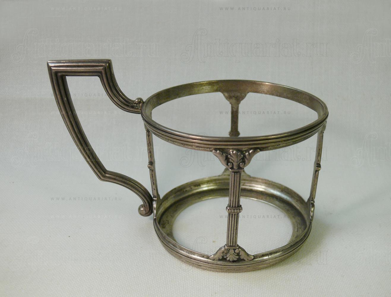 Серебряный подстаканник открытого типа, в стиле классицизм, состоящий из двух рифлёных снаружи колец, соединённых четырьмя стилизованными под рифлёные же полуколонны коринфского ордера "столбиками". Высокая, фигурной формы ручка также рифлёная.