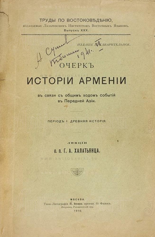 Лекции Г.А. Халатьянца. Период 1. Древняя история. М.: Типо-Лит. Ю. Венер преемн. О. Фальк, 1910. 360 c. Пробное стеклографированное издание профессора Г. Халатьянца. Отпечатано под грифом «Издание пробное».