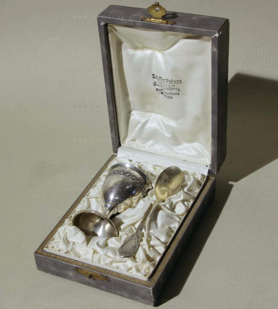 Серебряная пашотница в футляре бельгийского торгового дома, в набор входят подставка для яйца и ложечка.